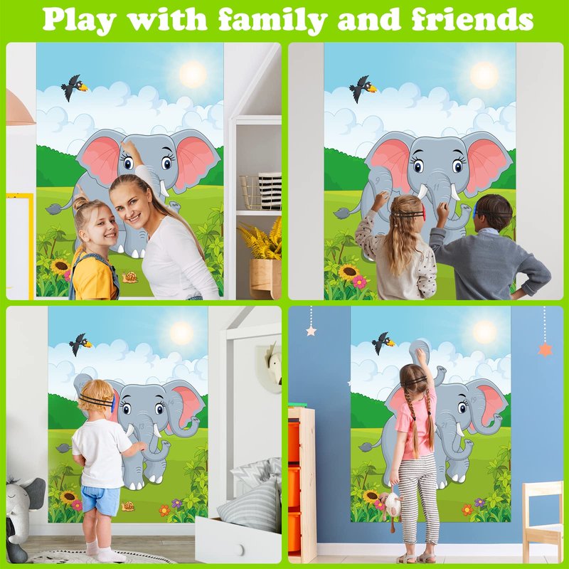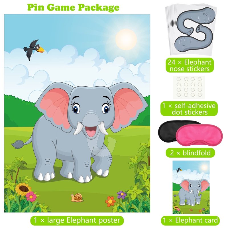 • Elephant party pin game set includes: 1* Elephant party game poster; 1* blindfolds; 24* elephant nose stickers; 12* self-adhesive dot stickers