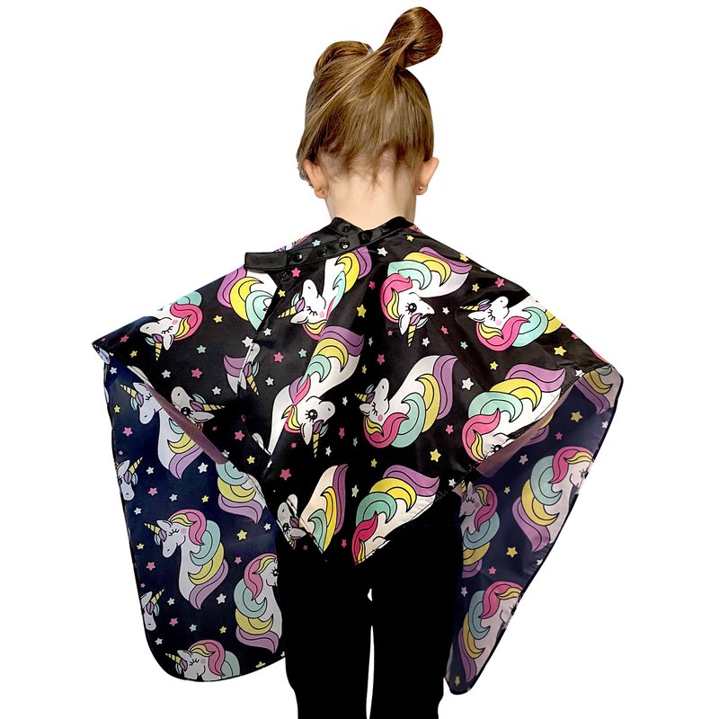 Everyone loves unicorns and this delightful cape will make haircuts more fun! Use for home hair cuts or for your professional salon or barber shop. This hair cutting cape is adjustable with the plastic snaps and will fit a range of kids from toddlers to young girls and boys.This cape is long enough to hang over the back of the chair at the salon and long enough to hang over their legs. The cape is 27 inches wide and 36 inches long. This water resistant cape will keep their clothes dry and hair free while they get their routine haircut. Even if your kids don't like getting their hair done, this cape is a bright and colorful pattern that will make them feel more excited and comfortable at the salon. If you do your child's hair at home, this lightweight came will make clean up a breeze. The unicorn design is fun and colorful and will catch any kid's eyes. Make haircuts feel like less of a chore by adding fun patterns and colors to your salon. This is a great accessory to add to your station.