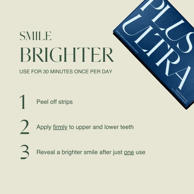 Enhance your natural smile with PLUS ULTRA's Premium Teeth Whitening Strips. Our 14 day teeth whitening treatment includes 28 strips total to make your teeth shine brighter. Extra gentle on sensitive teeth, Dentist approved, Eco-friendly, Vegan, Enamel Safe, Made with natural mint.