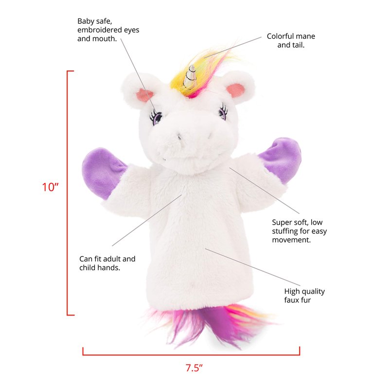 - QUALITY EMBROIDERED DESIGN: This unicorn hand puppet features an embroidered mouth and eyes. Carefully crafted to last for years of kids puppet show fun