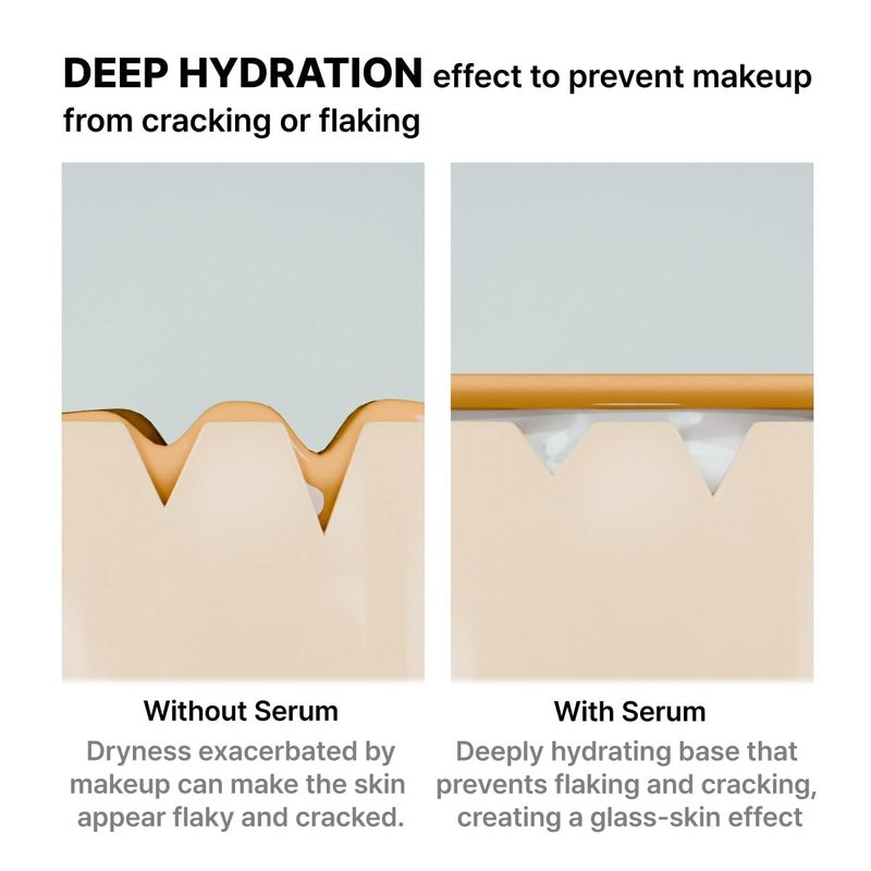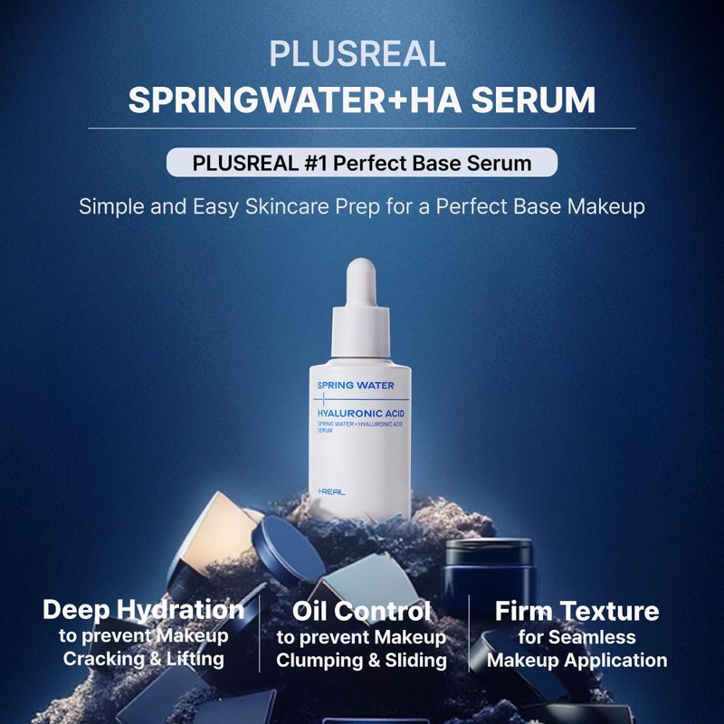 - Deep Hydration – Makeup cracking and lifting often stem from a lack of moisture deep within the skin. The PlusReal Spring Water + Hyaluronic Acid Serum infuses your skin with hydration from within, powered by 8 different sizes of hyaluronic acid molecules.