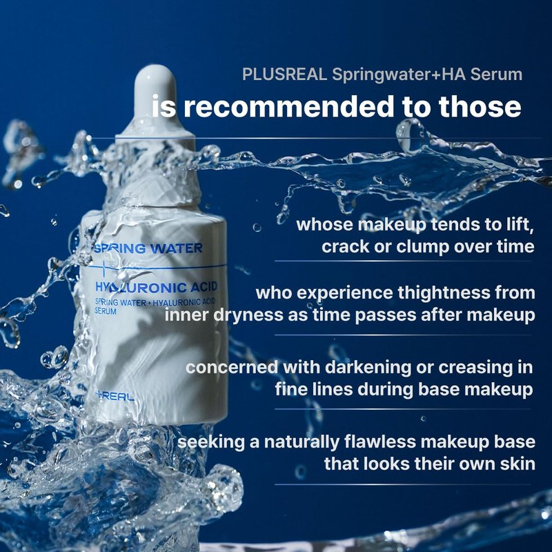 PLUSREAL Spring Water + Hyaluronic Acid Serum, 1.01 fl.oz.|Lightweight Deep Hydrating Face Serum to Prevent Cracky, Cakey Makeup
