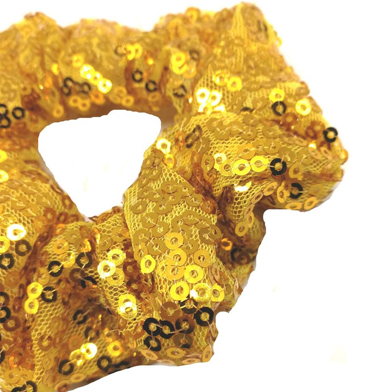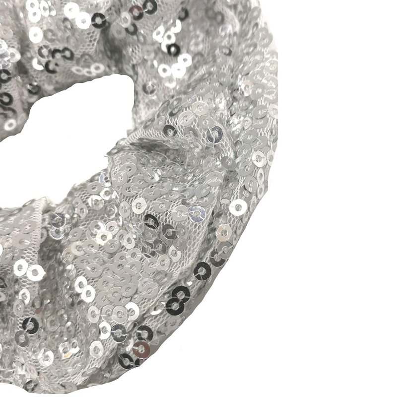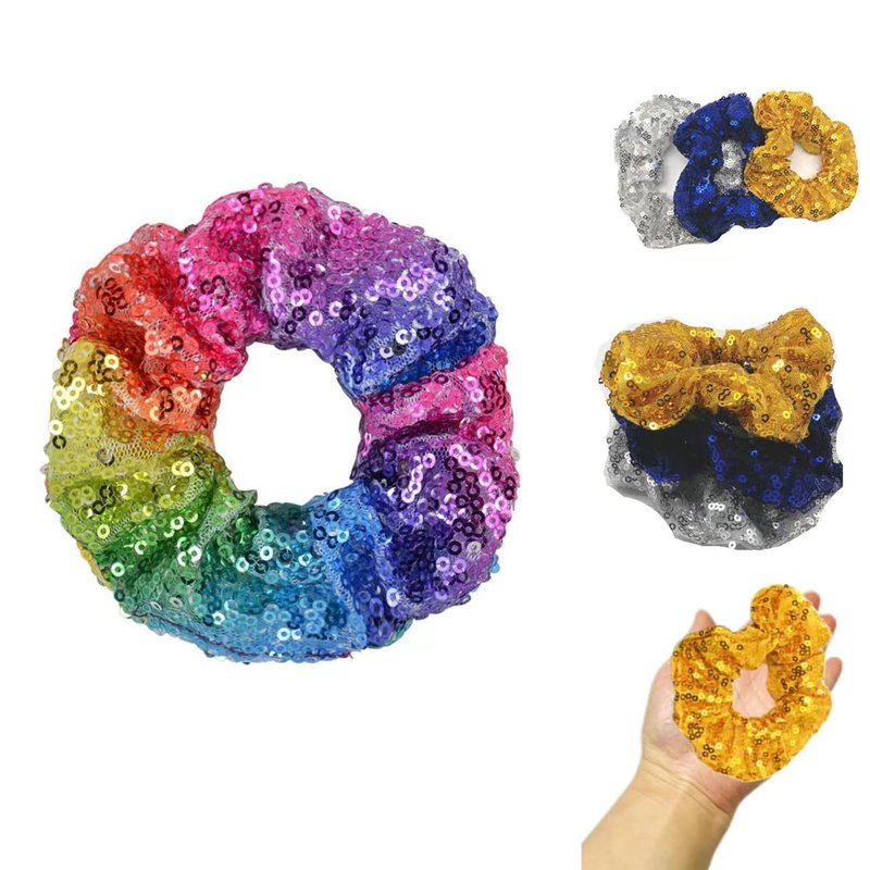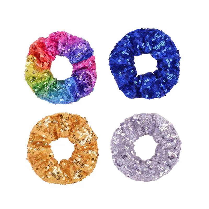 - This is a great little selection of 4 wonderful scrunchies. The package comes with lots of basic colors. Black, Pink,Gray, . There is something for everyone. These Sequin scrunchies are made of a fabric that is stretchable and elastic. Easy to use. Easy to wear. This is a really good value for 3good looking scrunchies.