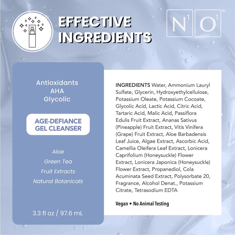 - INGREDIENTS: The Pneuma age-defiance gel cleanser contains Antioxidants, AHA, Glycolic, Aloe, Green Tea, Fruit extracts, Natural Botanicals and is gentle which is suitable for all skin types.