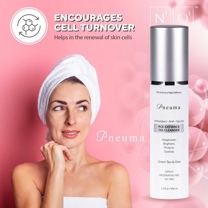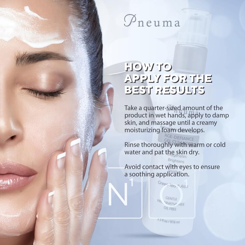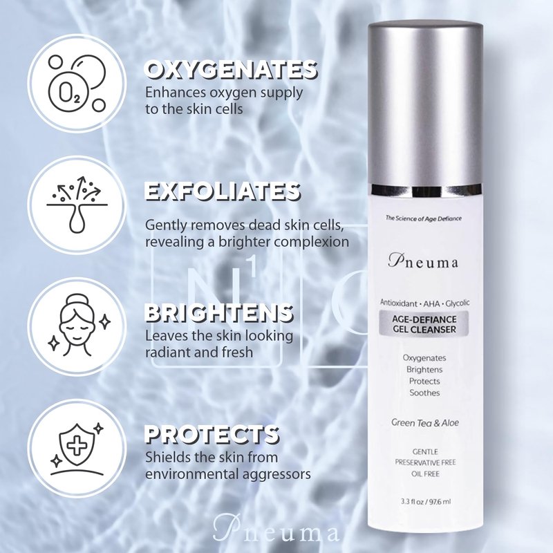- BENEFITS: The Pneuma age defiance gel cleanser is a perfect cleanser which rejuvinates, hydrate, brightens, oxygenate, encourages cell turnover and soothes the skin. It is preservative & oil-free which allows the skin to breathe fresh and is gentle on your skin. It is a daily face wash of alpha-hydroxy acid.