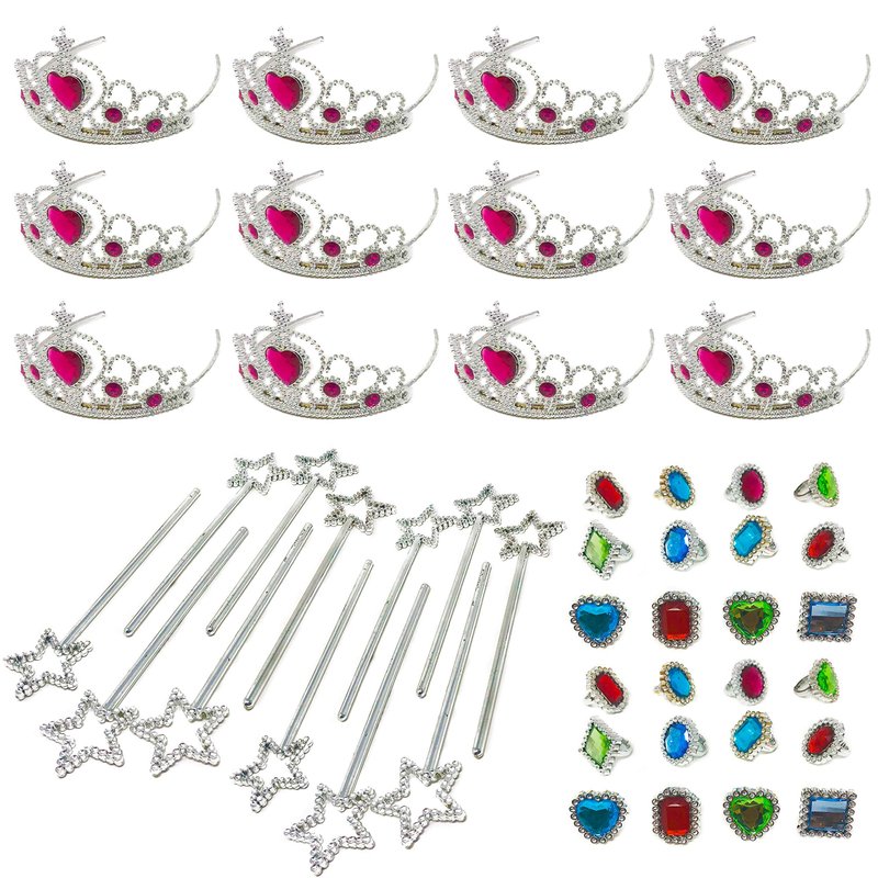Podzly - 48-Piece Princess Jewelry Set - 12 Tiaras, 12 Wands, 24 Rings - Perfect for Pretend Play, Birthday and Costume Party Favors - Accessories for Kids, Toddler - Dress Up Kit with Girl Crowns