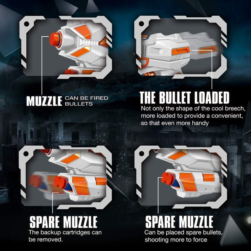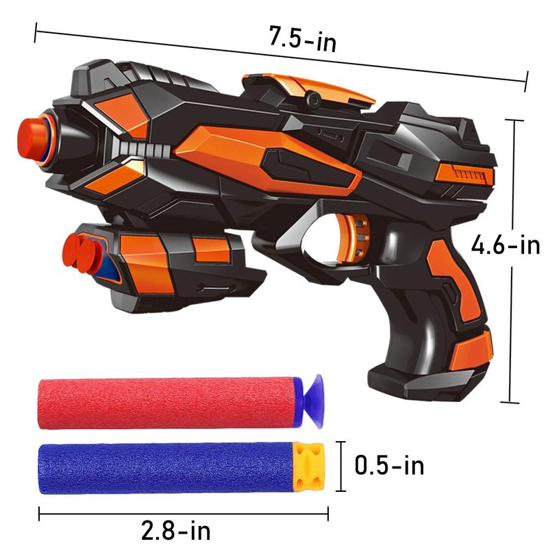 • Package Includes: 2 blaster guns (black and white) with 60 pcs soft foam bullet darts and 2 wristbands. Blaster Guns Dimension: 7.5*4.6 inch, suitable for children over 6 years old and adults.