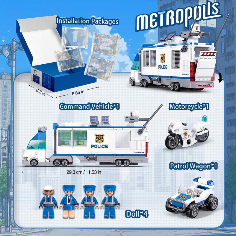 - 【City Police Cammand Vehicle】It includes a police command center that rotates 90°; 3 police vehicle models: 1 Police Motorcycle, 1 Police Command Car and 1 Patrol Car; 4 Police Officer Minifigures(policewomen and policemen), it is compatible with lego city police sets. As a role-play set, boys and girls can pretend to use these police toys to quickly pursue criminals and protect city peace!