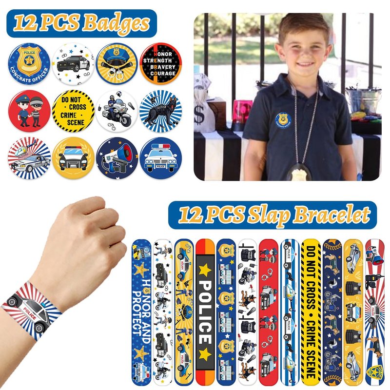 - What You Will Get: Our police party favors kits: 12pcs police(12 unique styles) slap bracelets, 12 sheet police temporary tattoos, 12Pcs police officer slap bracelets, 50pcs police stickers,12pcs mini police toy cars, 12Pcs police badge button badge, 12pcs police gift bags, enough quantity to meet your part