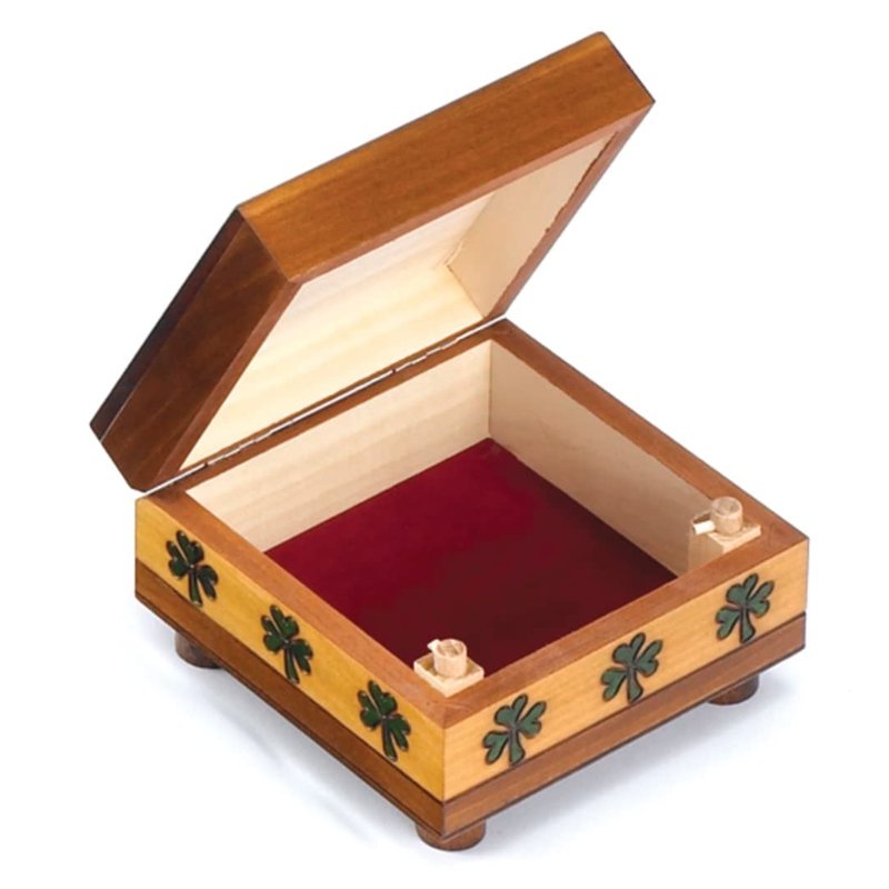 This trick box is decorated with a Claddaugh pattern over a shamrock on the lid and a band of shamrocks around the base. Rotate the two front feet to unlock the lid and open.