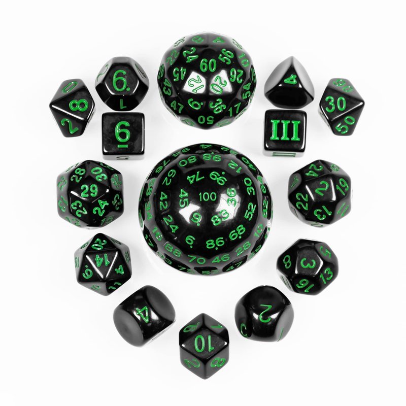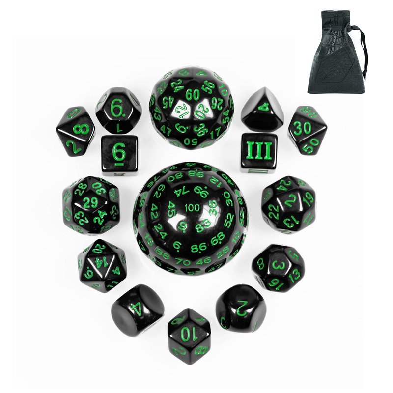 Poludie 15 Pieces Complete Polyhedral DND Dice Set D3-D100 Spherical D&D Dice Set with Dragon Eye Dice Bag, D100 Dice for Dungeons and Dragons, RPG, MTG Table Games(Black w/Green Numbers)