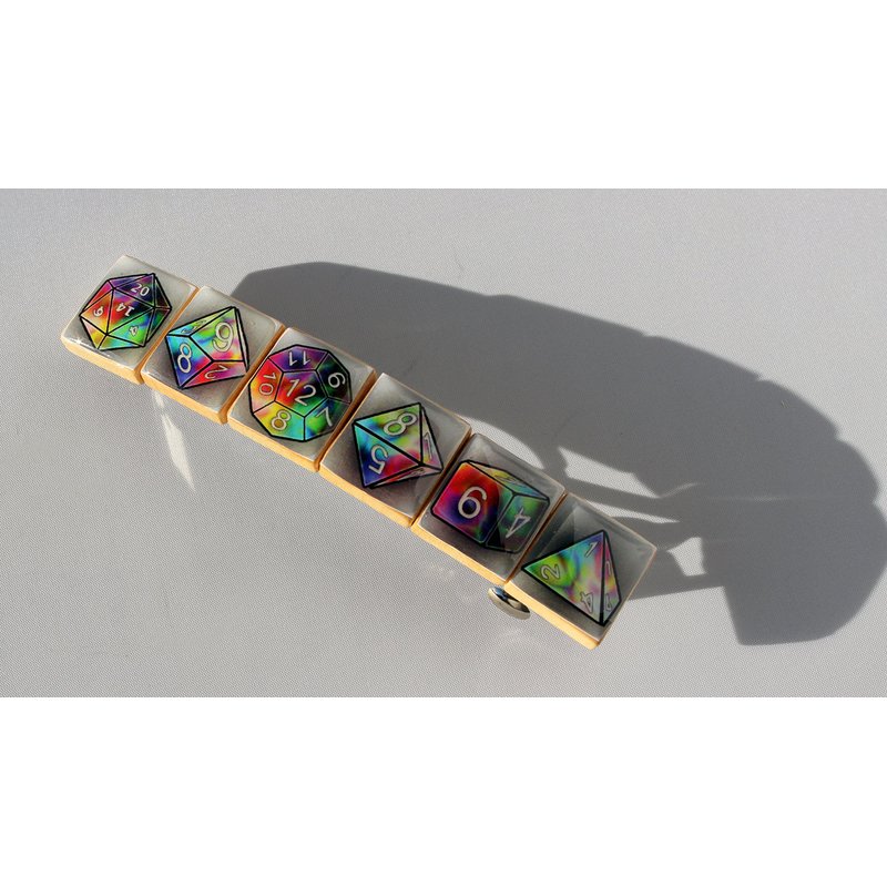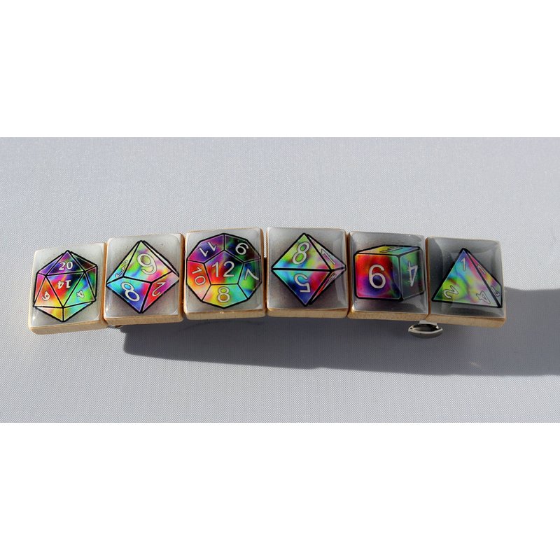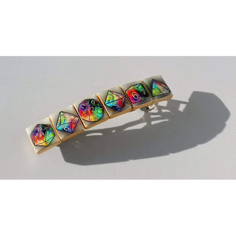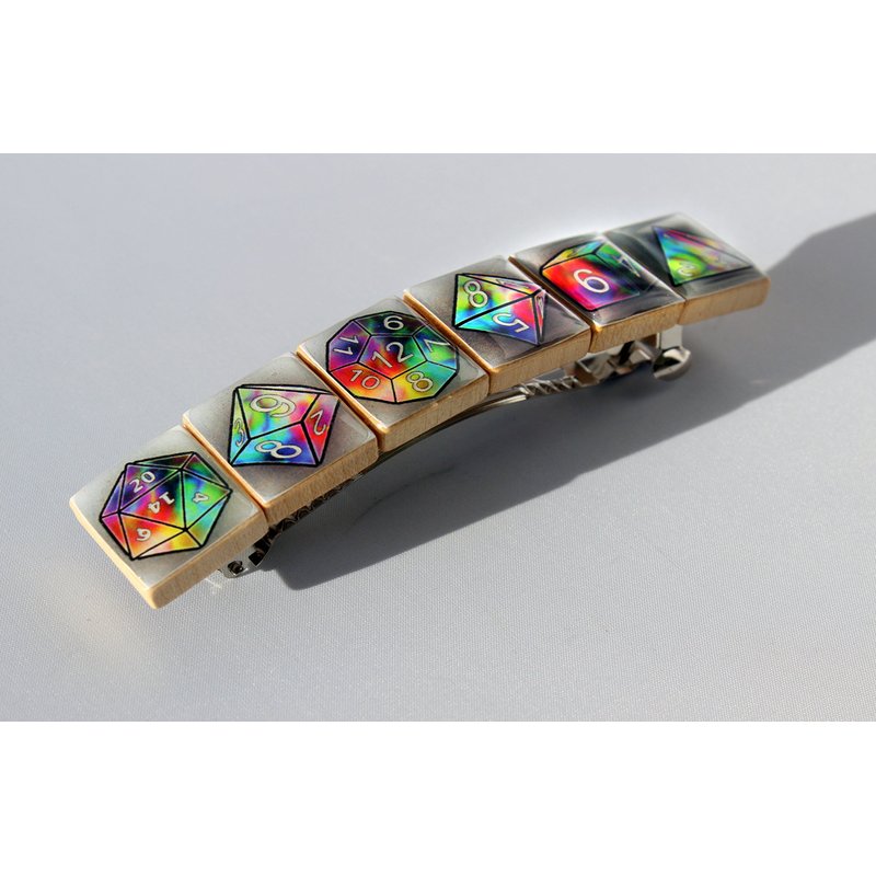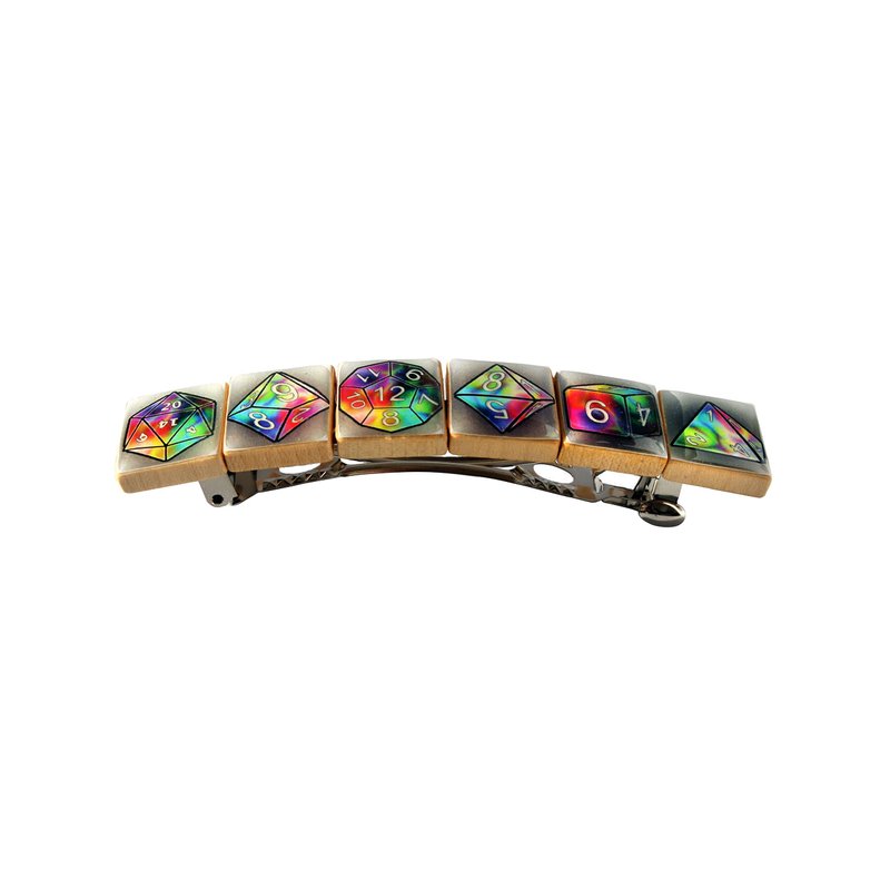 For those who dare to enter the epic world of Dungeons and Dragons, there is one accessory they cannot be without: a pack of polyhedral dice. And for those looking to keep their hair looking nice while battling skeletons, hobgoblins, and gelatinous cubes (hey, don't laugh, my brother-in-law went that way), we offer this 100mm barrette made from re-purposed Scrabble tiles. Each tile features the image of a specific die, all multicolored and sure to stand out. Custom orders are available for different colors, please allow additional production time for those.