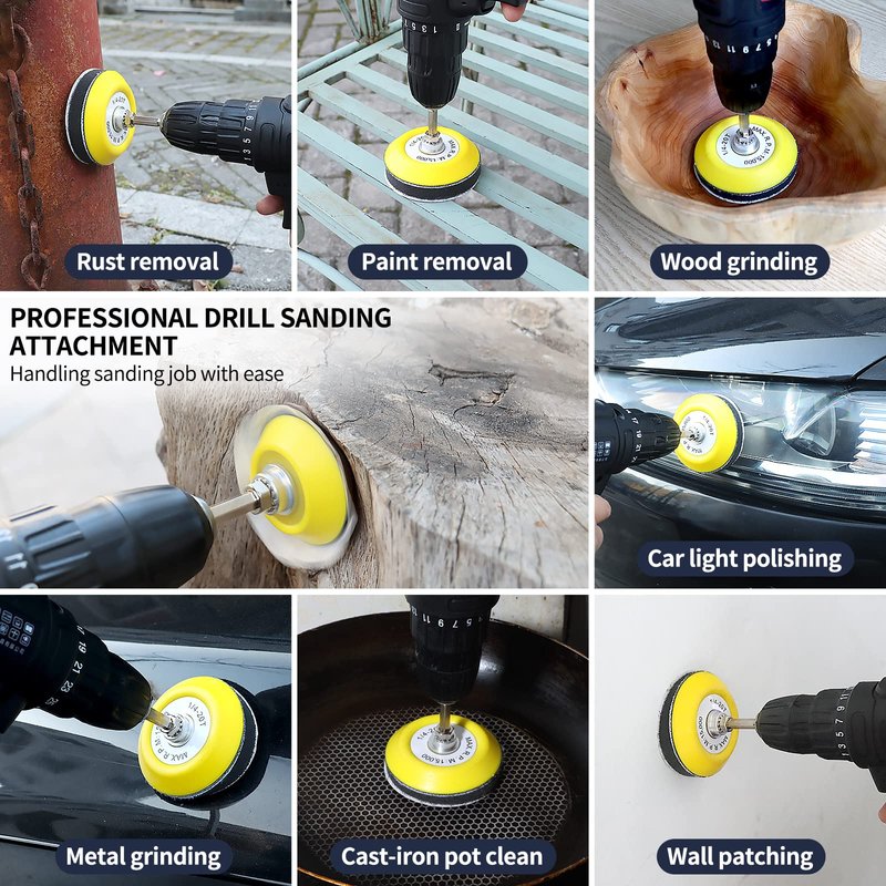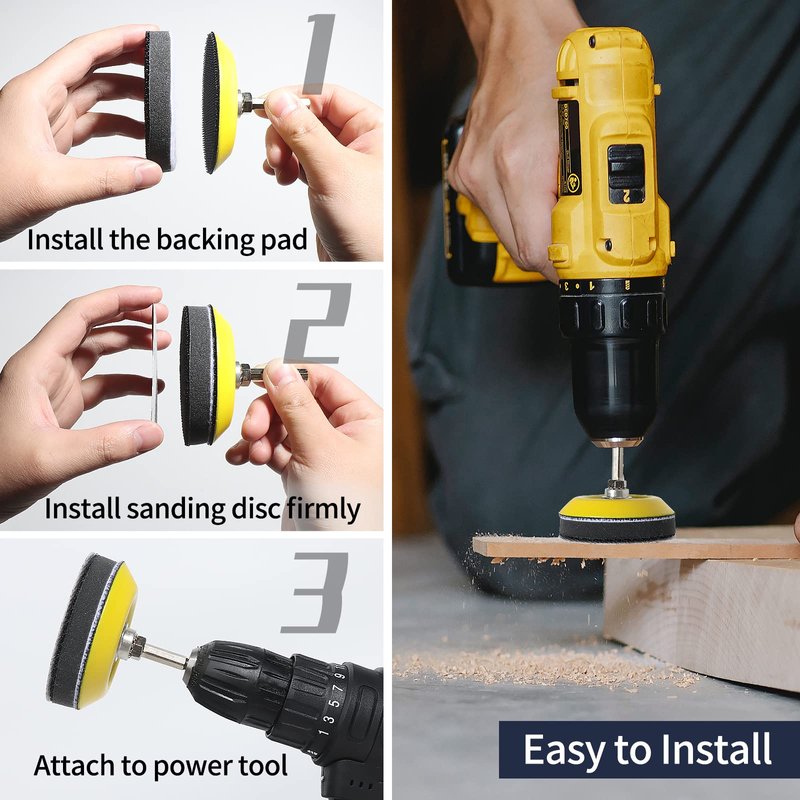 - 【All-in-one Complete Kit】The drill sanding attachment includes 120pcs of 3-inch sanding discs assortment in 80 to 3000 grit,1 pc of 3-inch backing pad with foam, 1 pc of 2-inch backing pad with foam buffering plate, 2 pcs of 1/4” round and hex shanks, 2 pcs of sponge sanding blocks.