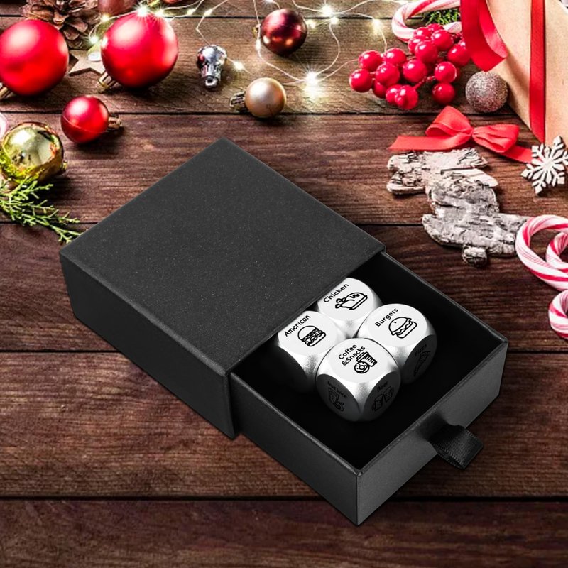 - ❤Package: There are 4Pcs Food Dice in a black gift box. ①Japanese, Italian, Mexican, Chinese, Indian, American; ②Fast Food, Chicken, Seafood, Sushi, Cake, Leftovers;③Steak, Burgers, BBQ, Pizza, Coffee & snack, Subs;④Fruit juice, Tea, Soda, Beer, Coffee, other.