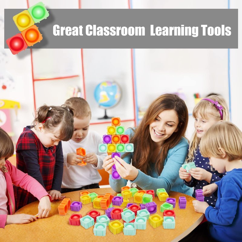 - [Infinty Pop Blocks] Like a lego toy, consists of 24 fidget popper blocks. Kids can creatively connect the blocks into different shapes, such as animals, letters, alphabet, numbers etc. And then play puzzle games on different shapes board.