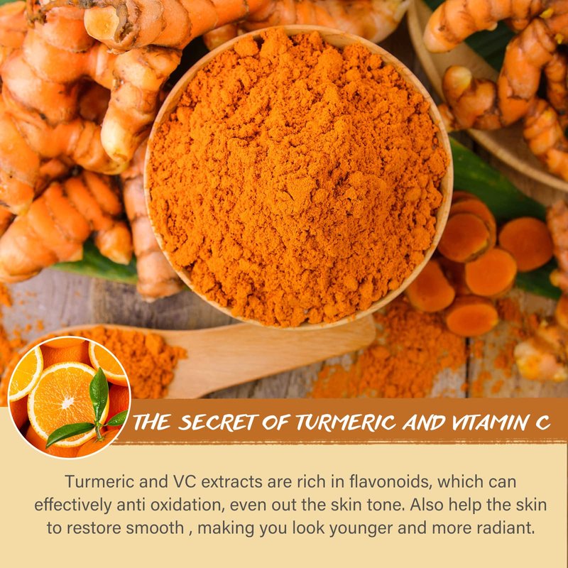 • VITAMIN C AND TURMERIC: Organic turmeric and vitamin C are rich in antioxidants that reduce melanin deposits, stimulate collagen production, even out skin tone, improve dull skin, and restore your youthful radiance.