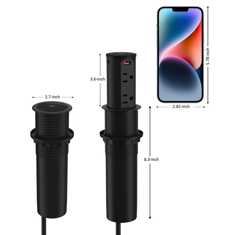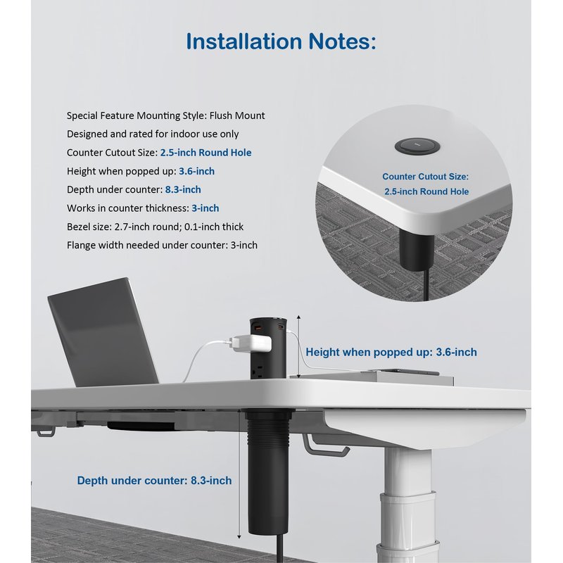 - 【Easy Installation】Jgstkcity pop up outlet fits a 2.5-inch (60mm) hole size,and has a built-in spring-loaded pop-up mechanism, simply press in the top to pop the unit up for use.Cut a 2.5 inch (60mm) hole, slide the outlet body in, and tighten the ring. Set up easily in your home, kitchen, office, or conference room.