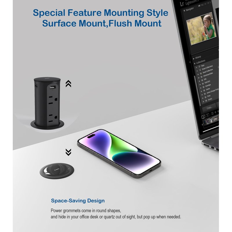 - 【Home Improvement Must Haves】The desktop mount counter top receptacle is tailored to provide home improvement must-haves.It's perfect for desk holes, countertops, conference tables, power grommets, – or anywhere else where added electric access may be needed. Whether you're wanting extra sockets in a conference room or a popup socket on your home office desk – no job’s too big or small.