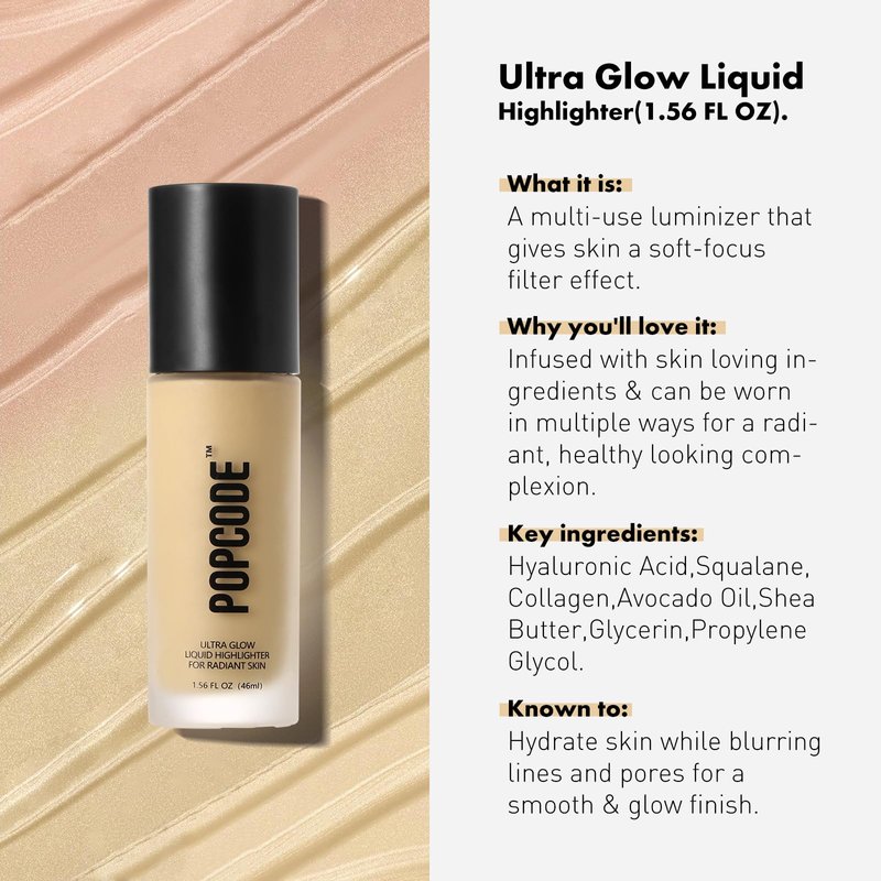 POPCODE Ultra Glow Liquid Highlighter Makeup for A Glowing Skin, Soft-Focus Look, Enriched with Hydrating Squalane Oil - Wear Alone or Under Makeup, Vegan & Cruelty-Free(1.56 oz)