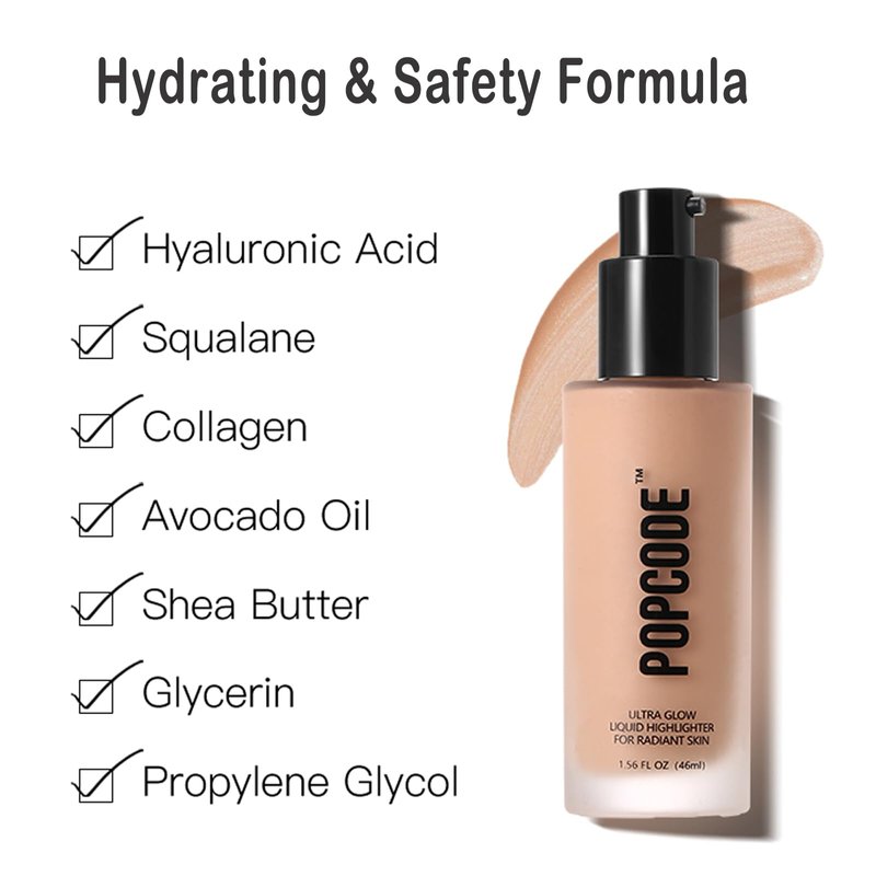 - Innovative Complexion Booster: POPCODE one of the glowiest, lightest weight liquid highlighters makeup. Wear it alone, under (or mixed with) foundation or tinted SPF as an illuminating and hydrating primer, or wear it over any look for super dewy, glass skin to illuminate the high points of your face.