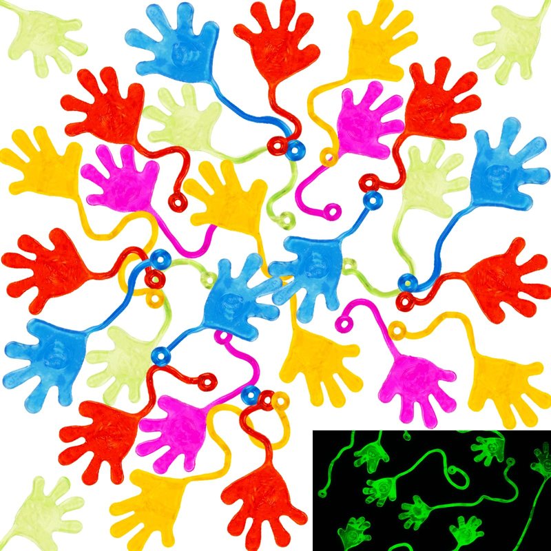 56PCS small sticky hands (3 different styles featuring 15PCS glow-in-the-dark sticky hands, 20PCS glitter sticky hands and 21PCS normal sticky hands)