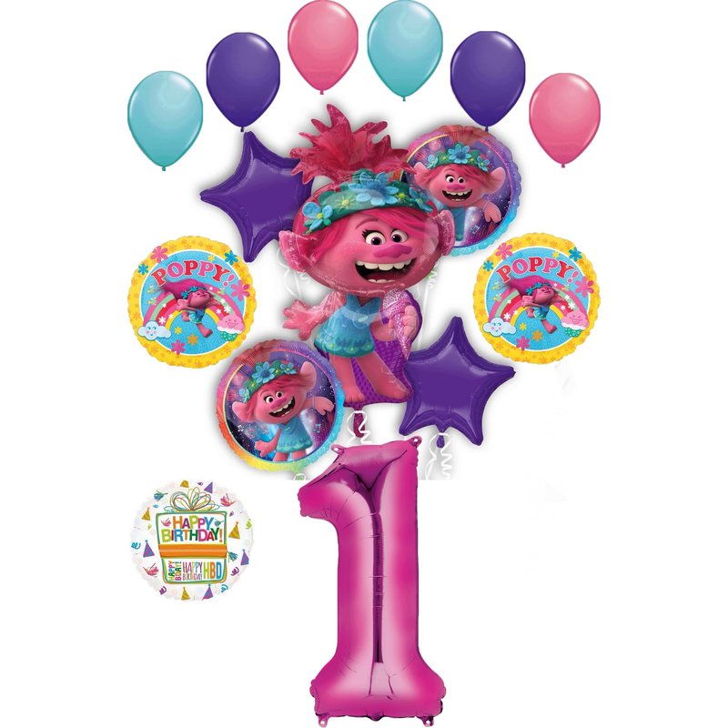 - (1) 37" Poppy Trolls World Tour Foil Balloon, (1) 34" Giant Pink Number 1 Foil Balloon, (2) 17" Poppy World Tour Foil Balloons, (2) 17" Poppy Foil Balloons, (2) 19" Purple Star Foil Balloons, (1) 18" Mayflower Products Happy Birthday Present Foil Balloon and (6) 11" Latex balloons 2-Turquoise, 2- Rose, 2 Purple Violet. Ribbon Not Included. All Anagram Licensed Balloons are Made in USA. Founded in 1977, Anagram International leads the world in innovating and manufacturing foil balloons.