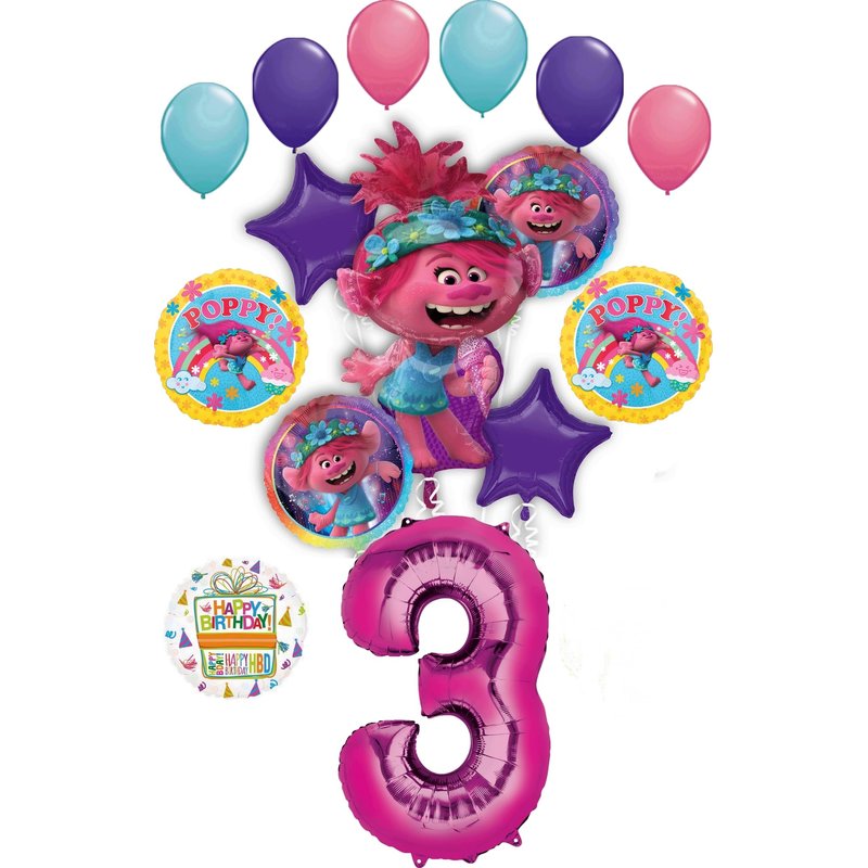 - (1) 37" Poppy Trolls World Tour Foil Balloon, (1) 34" Giant Pink Number 3 Foil Balloon, (2) 17" Poppy World Tour Foil Balloons, (2) 17" Poppy Foil Balloons, (2) 19" Purple Star Foil Balloons, (1) 18" Mayflower Products Happy Birthday Present Foil Balloon and (6) 11" Latex balloons 2-Turquoise, 2- Rose, 2 Purple Violet. Ribbon Not Included. All Anagram Licensed Balloons are Made in USA. Founded in 1977, Anagram International leads the world in innovating and manufacturing foil balloons.