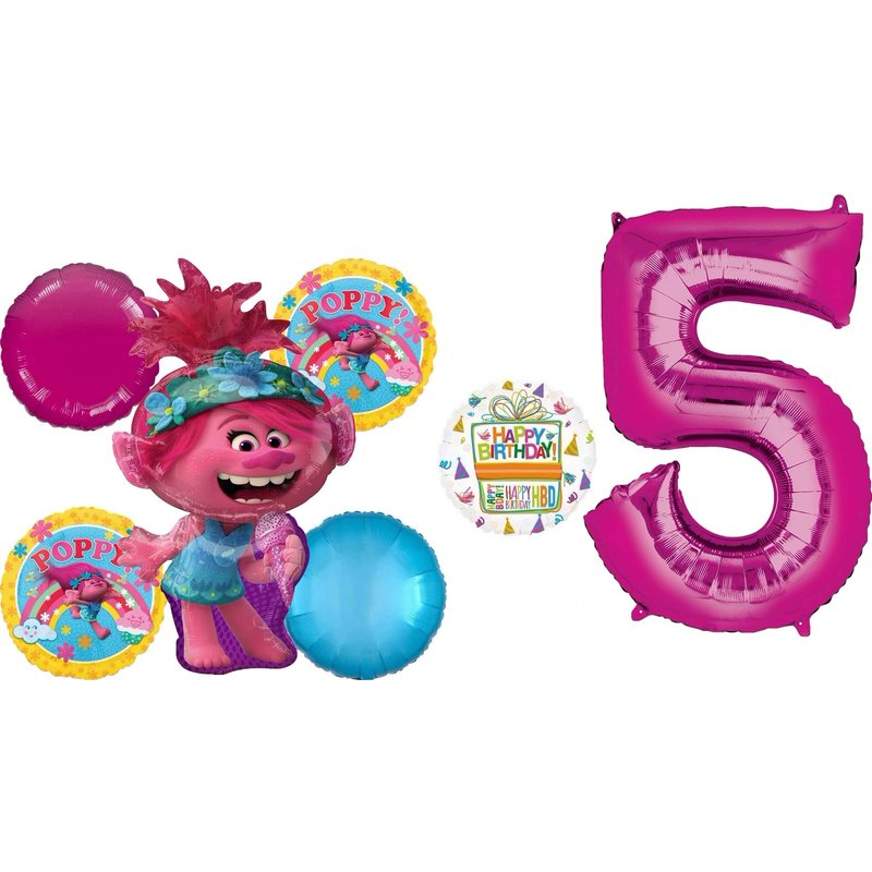 Poppy World Tour 5th Birthday Party Supplies Trolls 7pc Balloon Bouquet Decorations