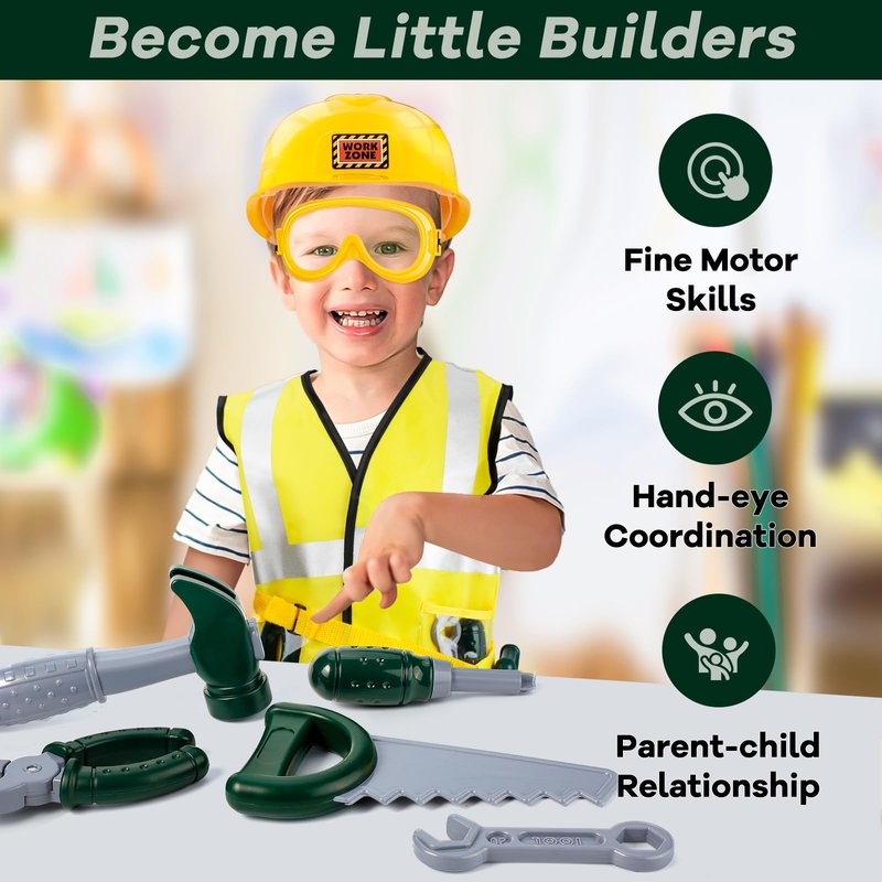 - Complete Construction Toys: Elevate playtime with our kids' tools costume set, featuring a construction vest, helmet, saw, goggles, hammer, vise, screwdriver and adjustable tool belt, ensuring a complete, immersive career experience for little builders