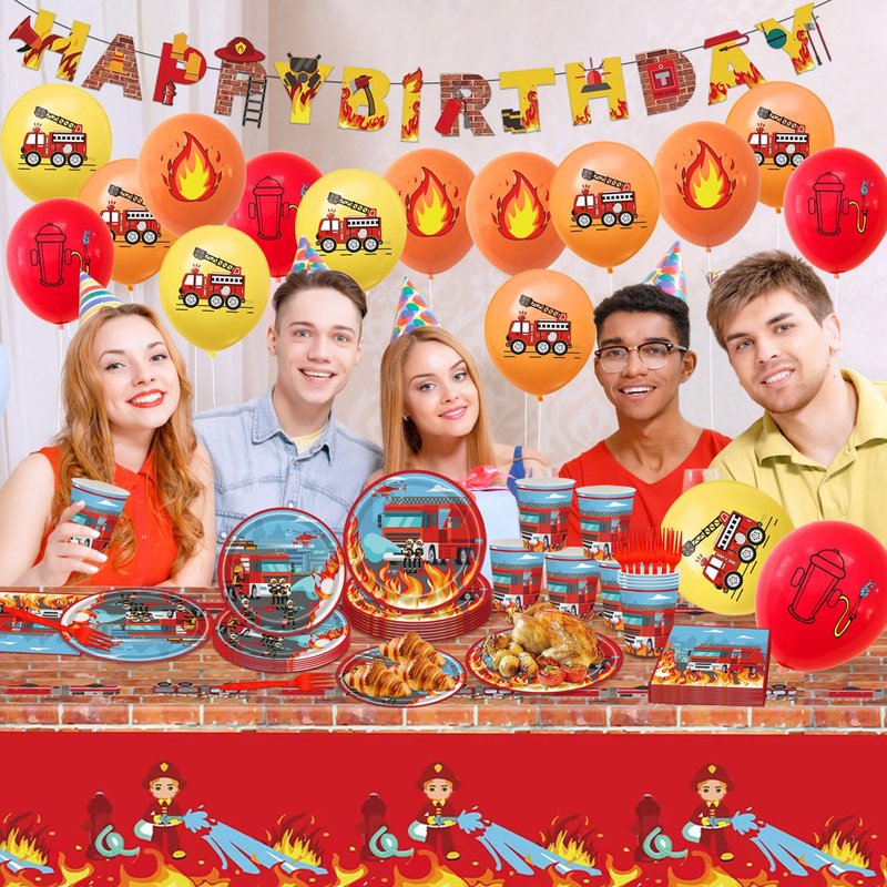 - Fire Truck Birthday Party Supplies Serve 20: This firefighter party tableware set that serves 20 people has 118 pieces, including 20 x fire truck dinner plates (9 inch), 20 x fire truck dessert plates (7 inch), 20 x fire truck cups, 20 x fire truck napkins, 20 x forks, 16 x Balloons, 1 x fire truck tablecloth (86.6"x51.2"), 1 x happy birthday banner. Meet all your firetruck birthday party decorations needs in one step.
