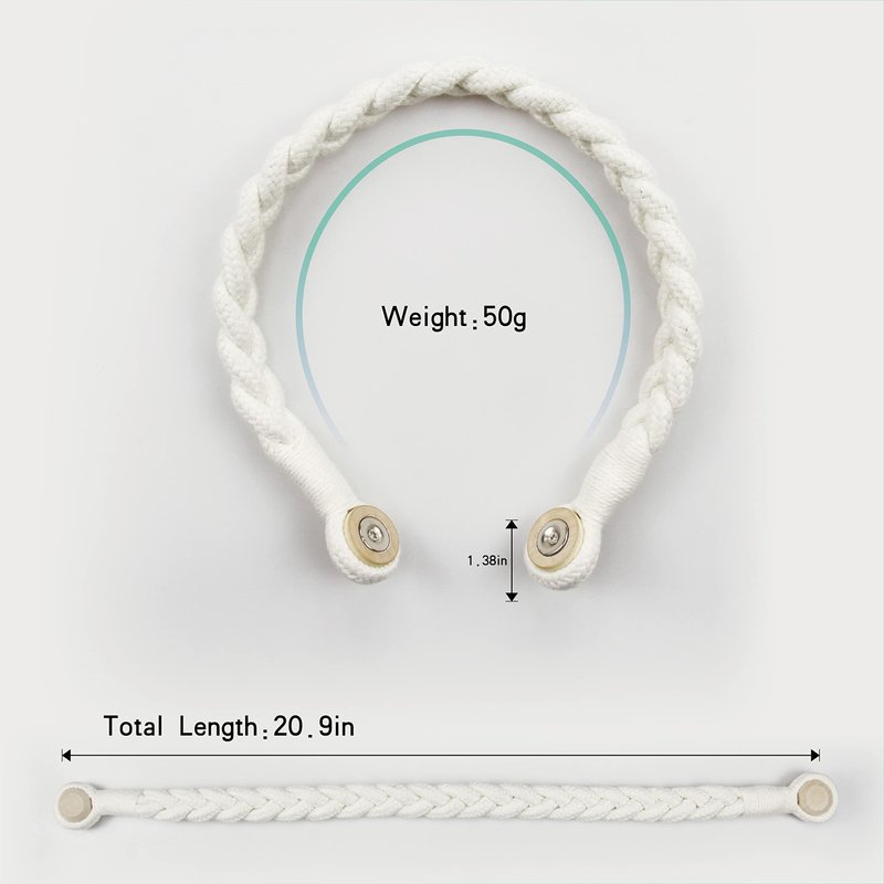 - Beautiful rope magnetic curtain tiebacks, Weight of 1 Pack- 0.11lb, Total Length - 20.9", Rope Diameter- 0.79". Could be twisted to adjust the length to meet your need, so no need to worry about the size is too big, suit for thin curtains, sheer curtains, thick shower curtains