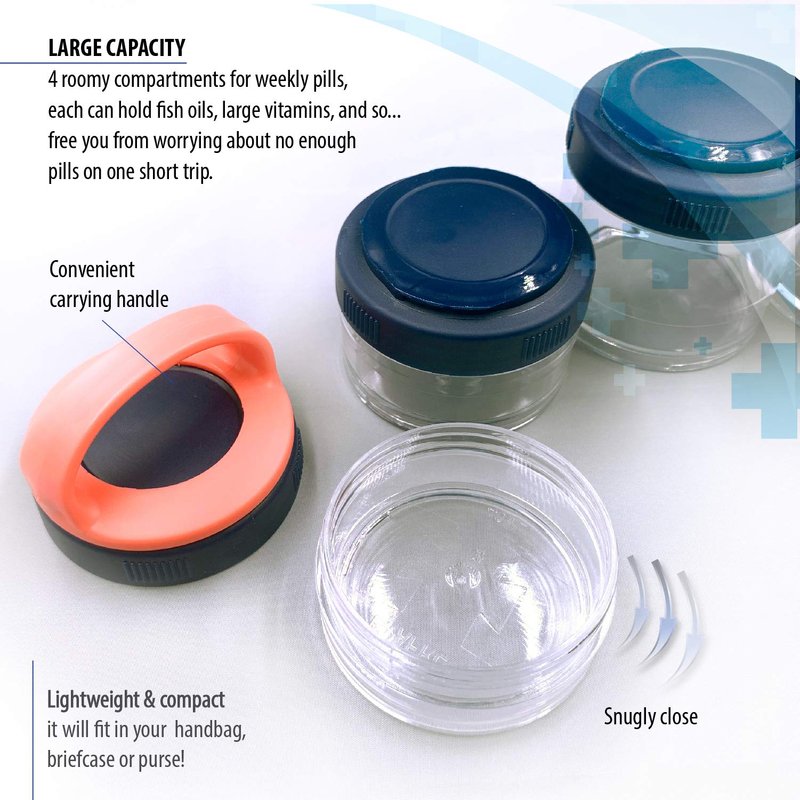 Tough detachable Pill bottle is made of high-quality plastic alloy materials which are non-toxic and non-allergic and can keep your pills clean Each layer of Medication organizer screwed with rubber O-ring, it provides a good seal to make it 100% waterproof, and the screw-cap arrangement means it won't open accidentally Pill case is a convenient and handy Medicine Container . The length can be adjusted according to your own needs and you can carry the tablets which you need Pillboxes are lightweight,large capacity but easy to carry in purse or pocket . And the handle can be clipped easily to key chains, handbags, golf bags, belt loops The little pill case is small and portable,but the capacity is large enough to contain several days supplements