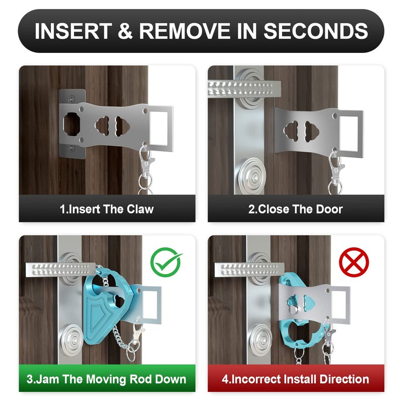 Upgrade door security device made of aluminum alloy and stainless steel material, makes Portable door lock more durable. The special design of the aluminum alloy handle groove can be used as a self-defense tool at emergency moments. The portable door lock keeps your security and privacy when traveling and alone in an apartment.