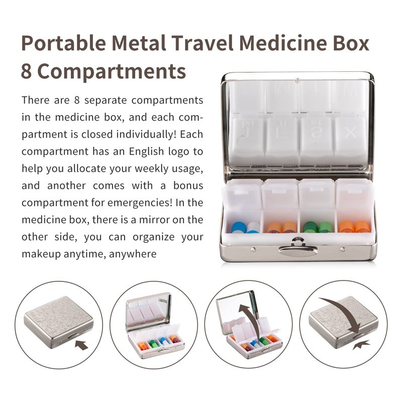 - 2.There are 8 separate compartments in the medicine box, and each compartment is closed individually! Each compartment has an English logo to help you allocate your weekly usage, and another comes with a bonus compartment for emergencies! In the medicine box, there is a mirror on the other side, you can organize your makeup anytime, anywhere