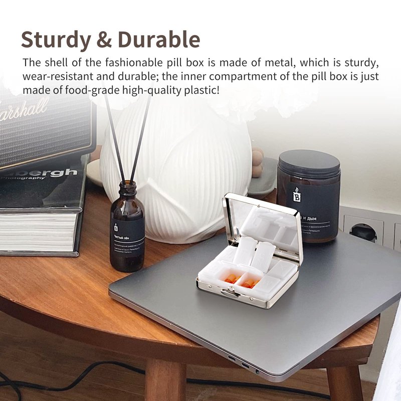 - 1. The shell of the fashionable pill box is made of metal, which is sturdy, wear-resistant and durable; the inner compartment of the pill box is just made of food-grade high-quality plastic!