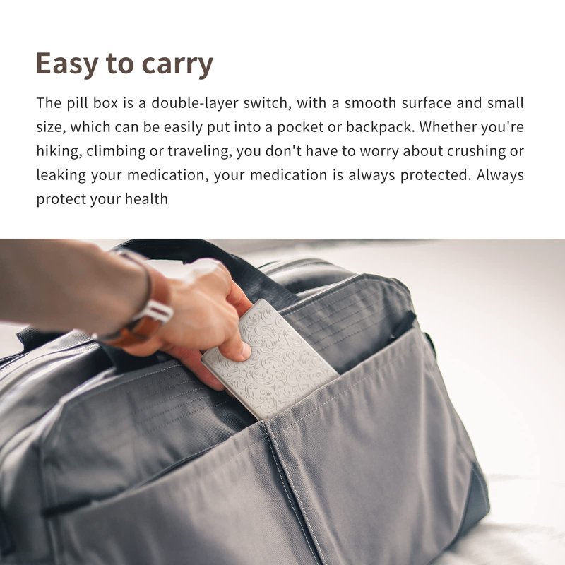 - 4.The pill box is a double-layer switch, with a smooth surface and small size, which can be easily put into a pocket or backpack. Whether you're hiking, climbing or traveling, you don't have to worry about crushing or leaking your medication, your medication is always protected. Always protect your health