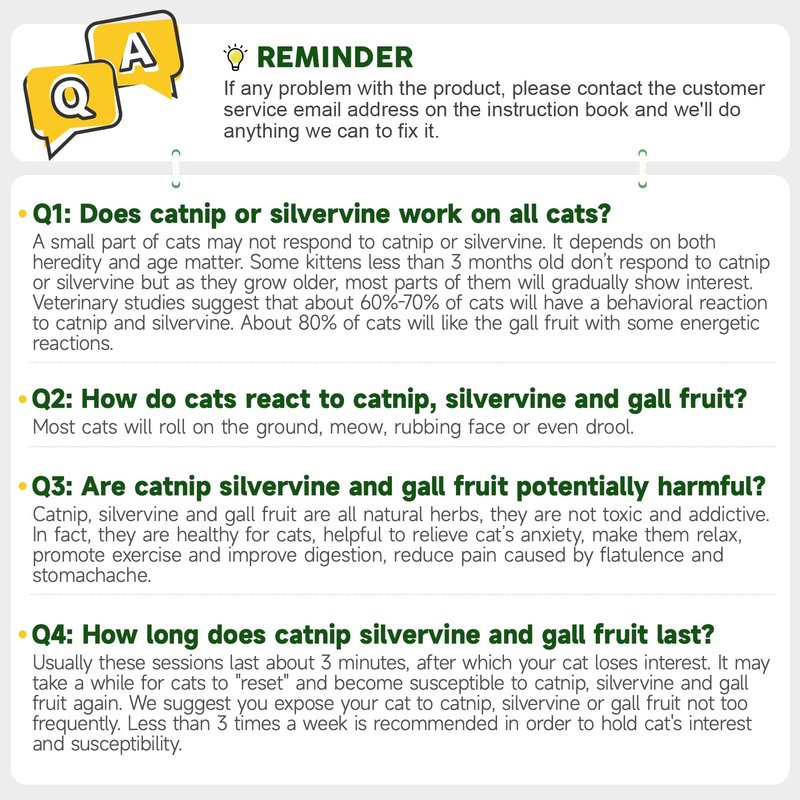 - 100% Natural and Non-toxic: the catnip balls are made of pure natural plant extracts, no chemical additives contained. Rest assured this toy is no harm to your favorite kitty. Includes 4 different flavors: “catnip”, “silvervine”, “fruit of silvervine” and "cat energy ball" that conspire to arouse your cat’s interest to lick and play