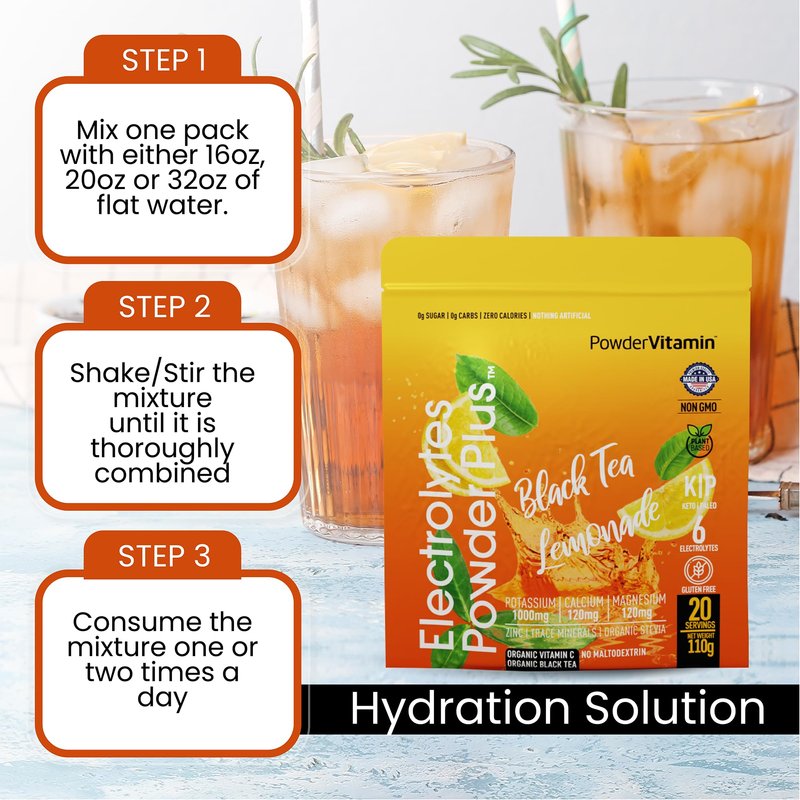 The Key to Keto Success Stay hydrated and ensure proper cell function after a day in the sun or a night on the town. PowderVitamin Electrolytes Powder No-Sugar Drink Mix naturally replaces mineral salts that your body lost while sweating over the lawn mower or partying with friends. This aids in post-workout recovery and promotes nausea and headache relief. Our Black Tea Lemonade-flavor electrolyte drink mix is a tasty and guilt-free way to stay hydrated and avert dizziness, nausea and other symptoms of keto flu. No Fillers or Additives Our no-sugar electrolyte powder is free of maltodexotrin, a claim that many other electrolyte drinks cannot make. It also contains many key vitamins and minerals so it does the work of a potassium supplement and magnesium supplement. Stabilize daily energy levels, receive important immune support, and stay hydrated for peak physical and mental performance with everything you need and nothing that you don't. Each 110-gram resealable pouch of PowderVitamin Keto Electrolyte Powder makes 20 servings. Made in the USA This electrolytes no-sugar hydration powder is manufactured at FDA-compliant, GMP-certified facilities for your peace of mind. It contains 100-percent clean magnesium citrate, potassium citrate, and organic Vitamin C + zinc, with no artificial flavors, fillers or chemicals. This makes it ideal for occasions when you need fasting electrolytes. Simply stir 1 scoop into water until dissolved and enjoy. Deliciously re-hydrate without calories or sugar. Add PowderVitamin Electrolytes Keto Powder Plus to your keto drinks today.