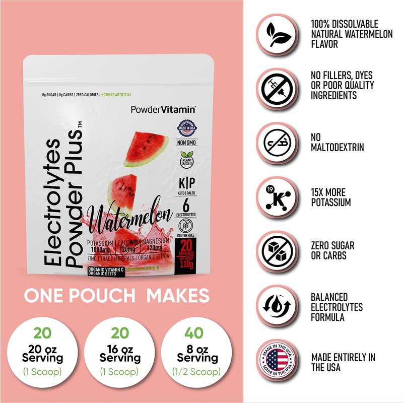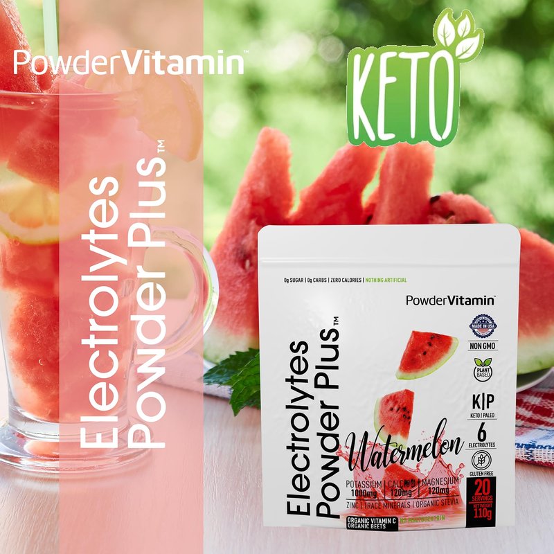 The Key to Keto Success Stay hydrated and ensure proper cell function after a day in the sun or a night on the town. PowderVitamin Electrolytes Powder No-Sugar Drink Mix naturally replaces mineral salts that your body lost while sweating over the lawn mower or partying with friends. This aids in post-workout recovery and promotes nausea and headache relief. Our Watermelon -flavor electrolyte drink mix is a tasty and guilt-free way to stay hydrated and avert dizziness, nausea and other symptoms of keto flu. No Fillers or Additives Our no-sugar electrolyte powder is free of maltodexotrin, a claim that many other electrolyte drinks cannot make. It also contains many key vitamins and minerals so it does the work of a potassium supplement and magnesium supplement. Stabilize daily energy levels, receive important immune support, and stay hydrated for peak physical and mental performance with everything you need and nothing that you don't. Each 110-gram resealable pouch of PowderVitamin Keto Electrolyte Powder makes 20 servings. Made in the USA This electrolytes no-sugar hydration powder is manufactured at FDA-compliant, GMP-certified facilities for your peace of mind. It contains 100-percent clean magnesium citrate, potassium citrate, and organic Vitamin C + zinc, with no artificial flavors, fillers or chemicals. This makes it ideal for occasions when you need fasting electrolytes. Simply stir 1 scoop into water until dissolved and enjoy. Deliciously re-hydrate without calories or sugar. Add PowderVitamin Electrolytes Keto Powder Plus to your keto drinks today.