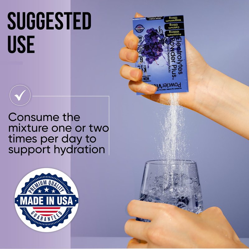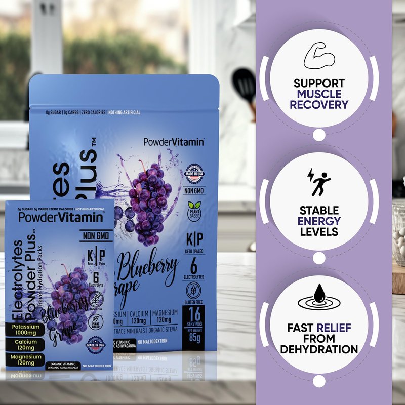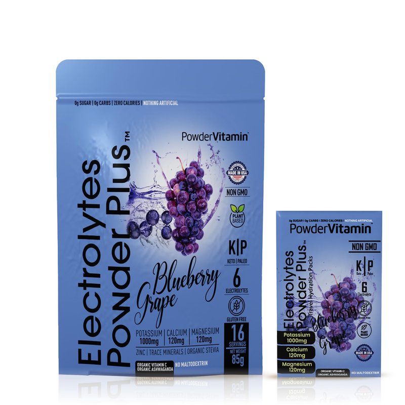 - Electrolyte Powder - Electrolytes Powder Plus contains 1000 mg of potassium opposed to only 250 mg in other brands. Additional we offer a unique flavor and blend of Magnesium, Calcium, Organic Pink Himalayan salt. Our delicious and hydrating blend of Blueberry Grape flavor includes 16 hydration packets for exercise, travel, or long nights. PowderVtmain Electrolytes Powder plus travel hydration packets has you covered.
