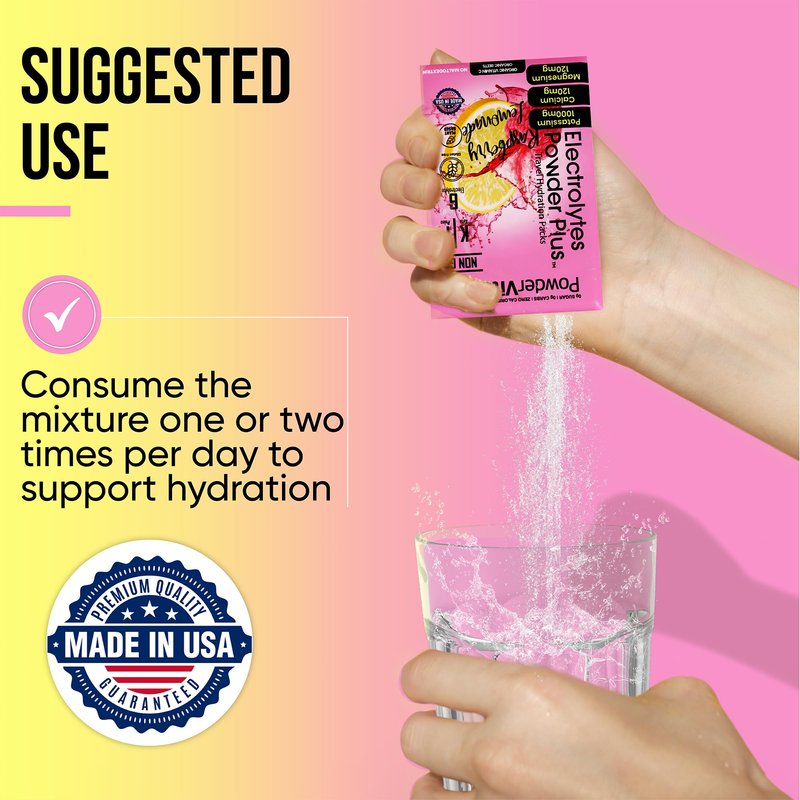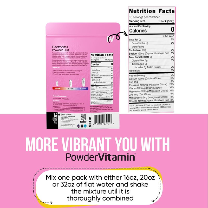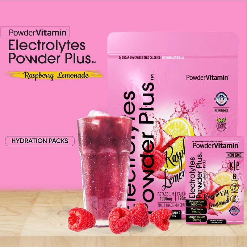 - Electrolyte Powder - Electrolytes Powder Plus contains 1000 mg of potassium opposed to only 250 mg in other brands. Additional we offer a unique flavor and blend of Magnesium, Calcium, Organic Pink Himalayan salt. Our delicious and hydrating blend of Raspberry Lemonade flavor includes 16 hydration packets for exercise, travel, or long nights. PowderVtmain Electrolytes Powder plus travel hydration packets has you covered.