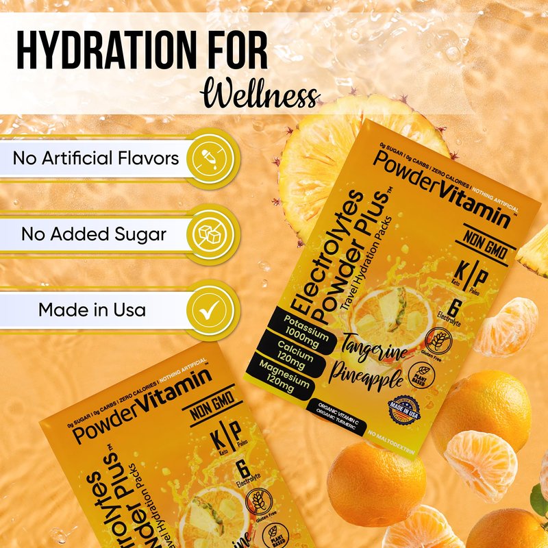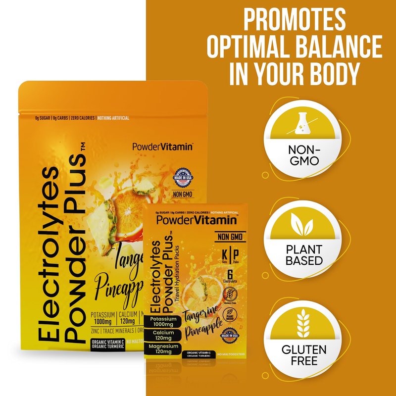 - Electrolyte Powder - Electrolytes Powder Plus contains 1000 mg of potassium opposed to only 250 mg in other brands. Additional we offer a unique flavor and blend of Magnesium, Calcium, Organic Pink Himalayan salt. Our delicious and hydrating blend of Tangerine Pineapple flavor includes 16 hydration packets for exercise, travel, or long nights. PowderVtmain Electrolytes Powder plus travel hydration packets has you covered.