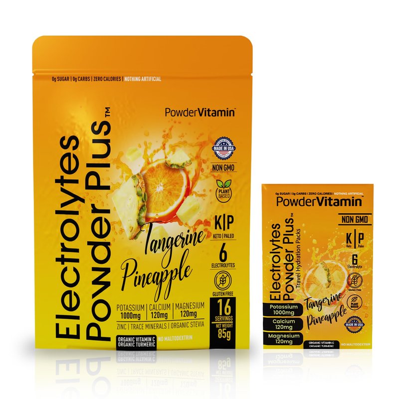 The Key to Keto Success Stay hydrated and ensure proper cell function after a day in the sun or a night in the town. PowderVitamin Electrolytes Powder No-Sugar Drink Mix naturally replaces mineral salts that your body lost while sweating over the lawn mower or partying with friends. This aids in post-workout recovery. Our Tangerine Pineapple-flavor electrolyte drink mix is a tasty and guilt-free way to stay hydrated. No Fillers or Additives Our no-sugar electrolyte powder is free of maltodextrin, a claim that many other electrolyte drinks cannot make. It also contains many key vitamins and minerals, so it does the work of a potassium supplement and magnesium supplement. Stabilize daily energy levels, stay hydrated for peak physical and mental performance with everything you need and nothing that you don't. Each bag contains 85 grams powder packet of PowderVitamin Keto Electrolyte Powder equals to 16 packets. Made in the USA This electrolytes no-sugar hydration powder is manufactured at FDA-compliant, GMP-certified facilities for your peace of mind. It contains 100-percent clean magnesium citrate, potassium citrate, organic beets, and organic Vitamin C + zinc, with no artificial flavors, fillers, or chemicals. This makes it ideal for occasions when you need fasting electrolytes. Simply stir 1 packet into water until dissolved and enjoy. Deliciously re-hydrate without calories or sugar. Add PowderVitamin Electrolytes Keto Powder Plus to your keto drinks today