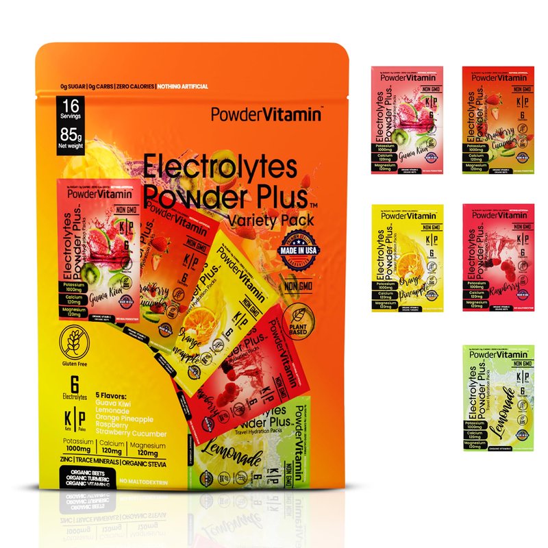 - Electrolyte Powder - Electrolytes Powder Plus contains 1000 mg of potassium opposed to only 250 mg in other brands. Additional we offer a unique flavor and blend of Magnesium, Calcium, Organic Pink Himalayan salt. Our delicious and hydrating blend of Variety Pack A flavor includes 16 hydration packets for exercise, travel, or long nights. PowderVtmain Electrolytes Powder plus travel hydration packets has you covered.