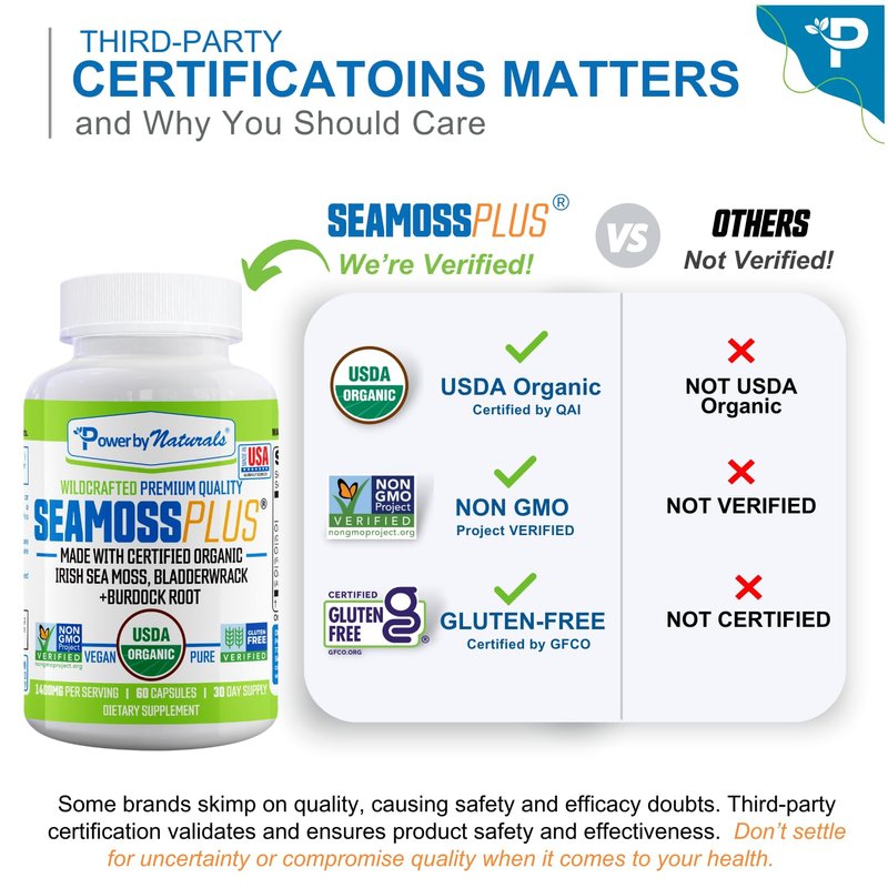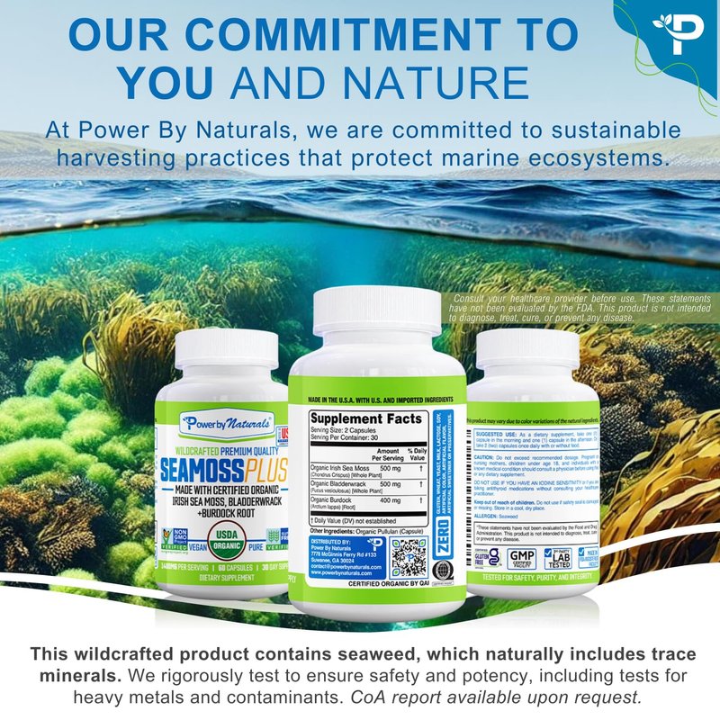 - Premium Quality Confidence: Not all sea moss is created equal. Power By Naturals sources only the finest-quality raw organic sea moss, maintaining strict quality control standards. Our sea moss capsules, backed by third-party certifications, are gluten-free, devoid of artificial colors/flavors, GMOs, binders, fillers, and preservatives. Choose purity for your body.