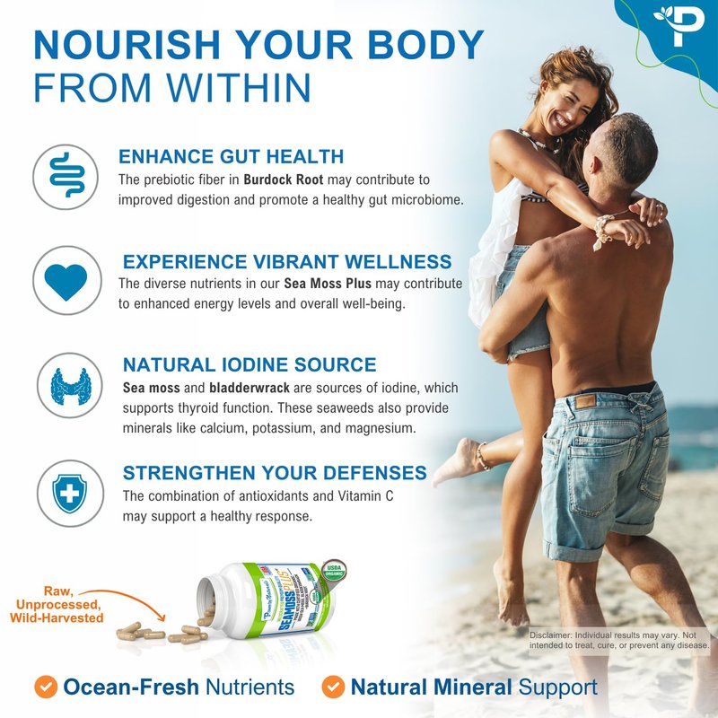 - Comprehensive Nutrient Nourishment: Unleash the power of nature with our Seamoss Plus blend, rich in essential vitamins and minerals such as iodine, zinc, iron, calcium, potassium, and silica. Just two capsules daily provide a resilient dose of Irish moss, bladderwrack, and burdock root, three herbal wonders that contribute to your optimal well-being and overall health!
