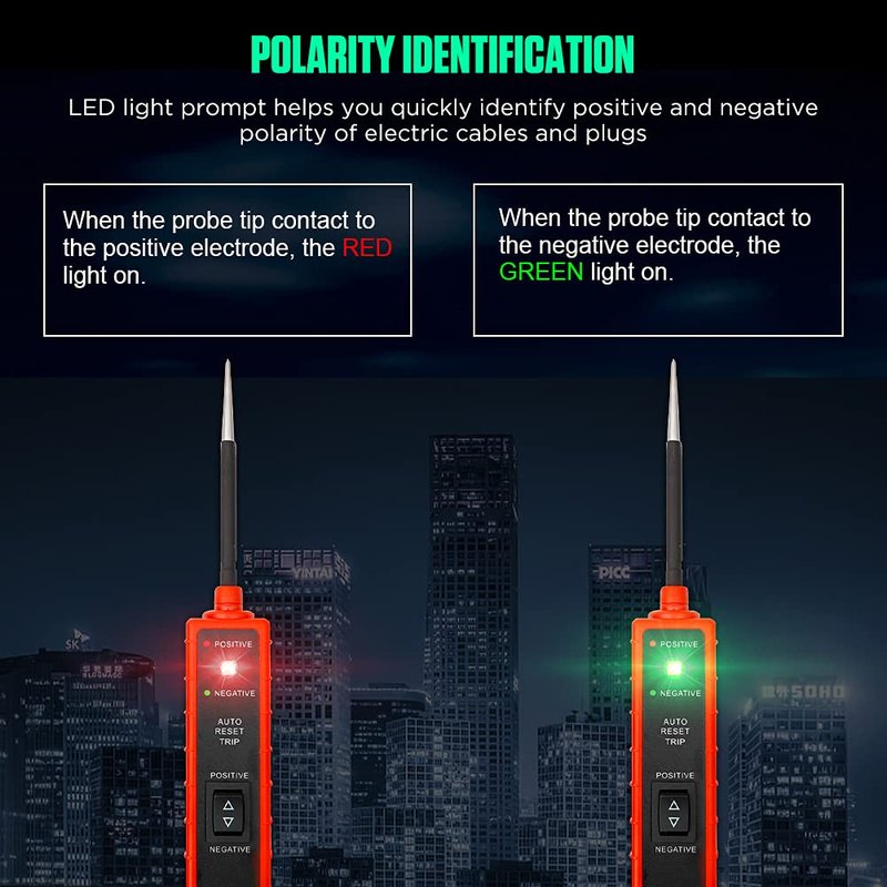 - 【Polarity Identification & Continuity Testing & Jumper Lead Operation】This power circuit probe tester can help you quickly identify positive and negative polarity of electric cables and plugs of vehicles. When the probe tip contact to the positive electrode, the RED light on. When the probe tip contact to the negative electrode, the GREEN light on. It can also test for continuity and do the jumper lead operation with the assistance of its auxiliary ground lead.