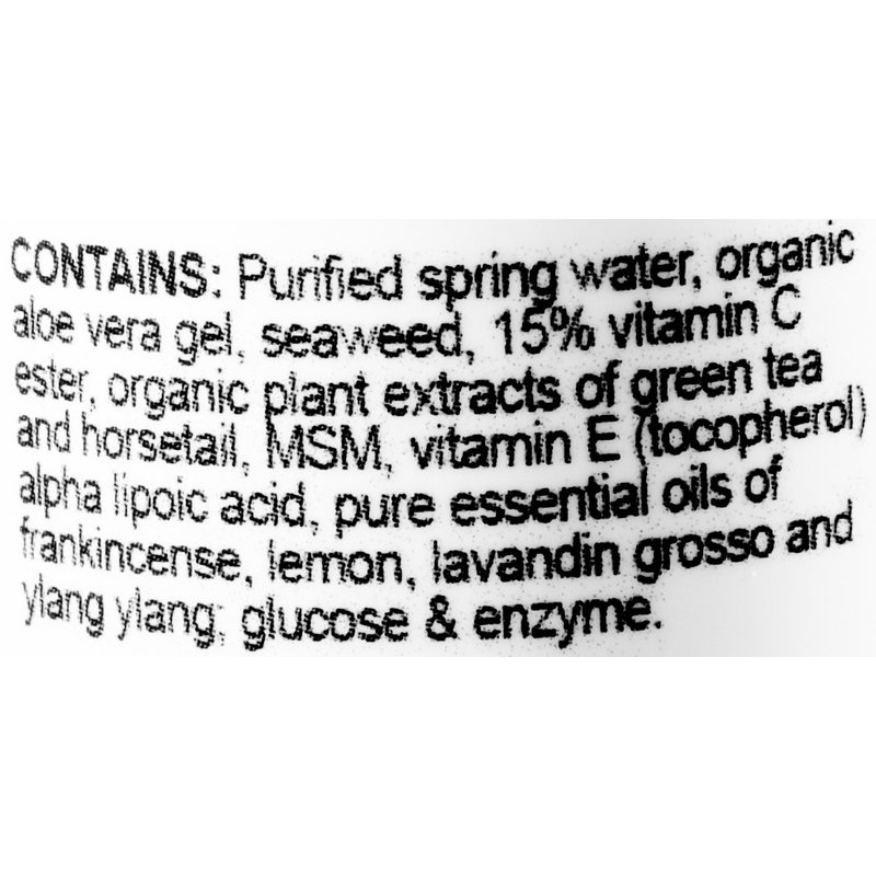 - CONTAINS: Purified spring water; organic aloe vera gel; seaweed, 15% vitamin C ester; organic plant extracts of green tea & horse-tail; MSM; vitamin E (tocopherol); alpha lipoic acid; pure essential oils of frankincense, lemon, lavandin grosso, and ylang ylang; glucose oxidase & enzyme lactoperoxidase.