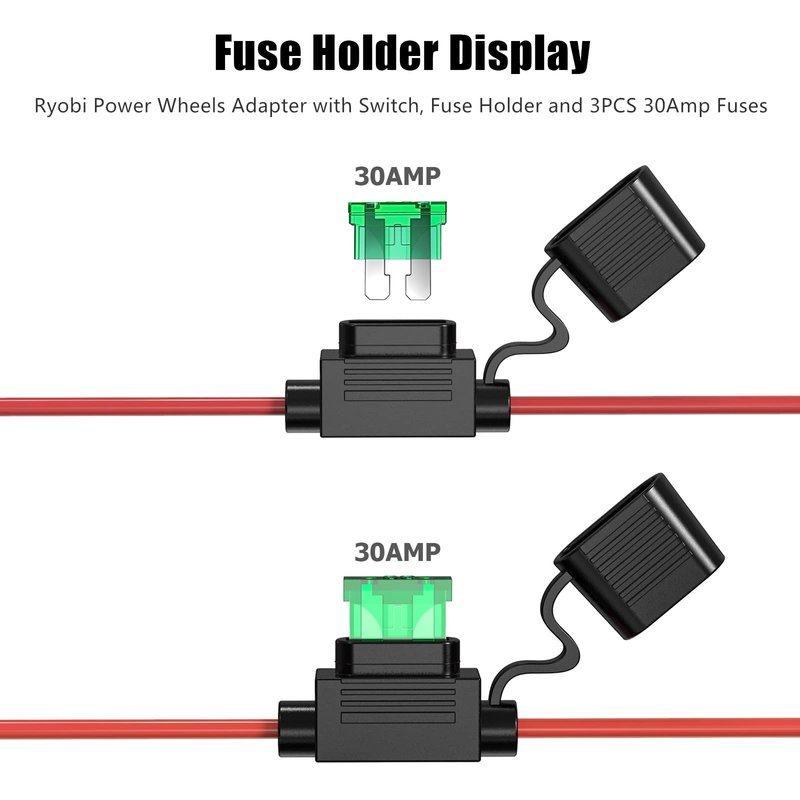 - Package includes 1 pack power wheels adaptor with switch, fuse holder and 3 pack 30amp blade fuses. Spare fuse for easy replacement in the future. Note: The red wire is connected to the positive terminal, and the black wire is connected to the negative. When using, the two wires shouldn't be in contact. If the power wheel adapter not be used for a long time, please separate it from the battery.