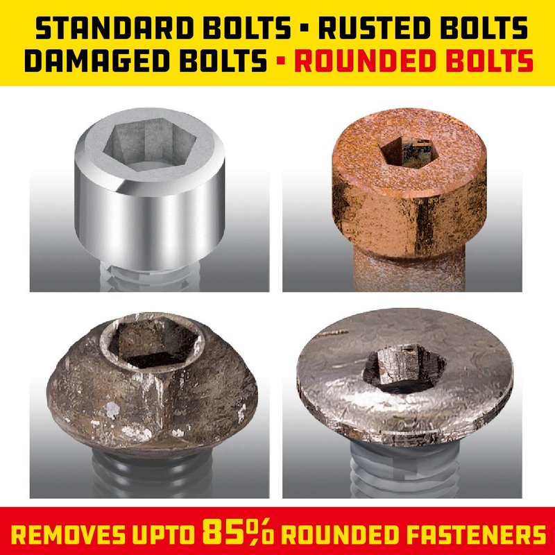- PATENTED DESIGN: Prevents bolts from striping while at the same time functions as a damage bolt removal tool. The unique design uses a spiral hex design that bits more the harder you push and turn.
